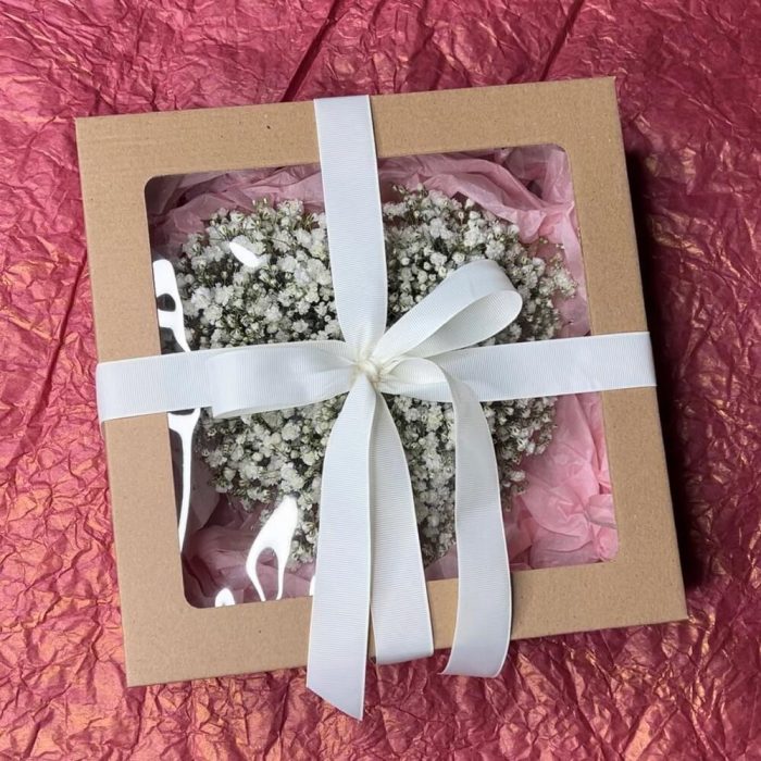 Гипсофила – 4 шт.Тишью – 1 шт.Коробка крафт – 1 шт.Оазис флористический – 1 шт.