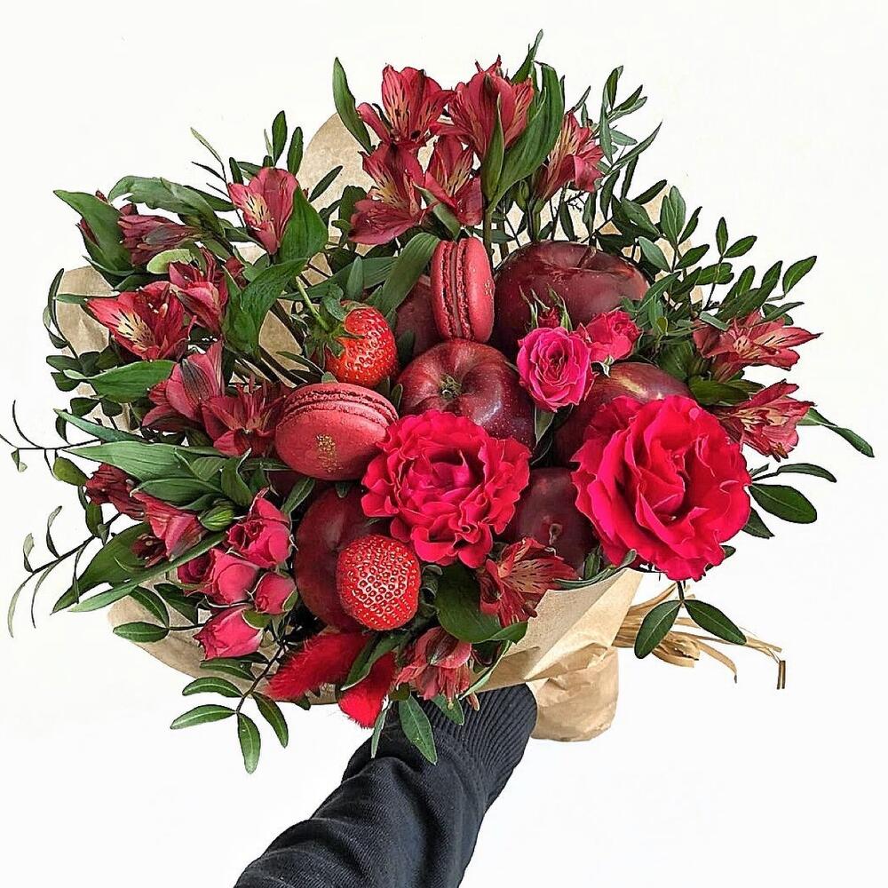 красные яблоки – 5 шт.нектарины или слива – 3 шт.Клубника – 2 шт.Пирожные макарон – 2 шт.Альстромерия красная – 3 шт.Роза красная одноголовая – 2 шт.Роза кустовая – 2 шт.зелень фисташки – 5 шт.