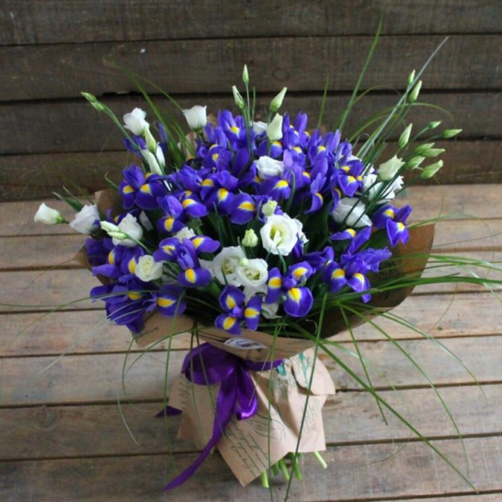 ирисы синие – 35 шт.эустома белая – 10 шт.зелень берграсс – 1 шт.Упаковка крафт – 1 шт.Атласная лента – 1 шт.