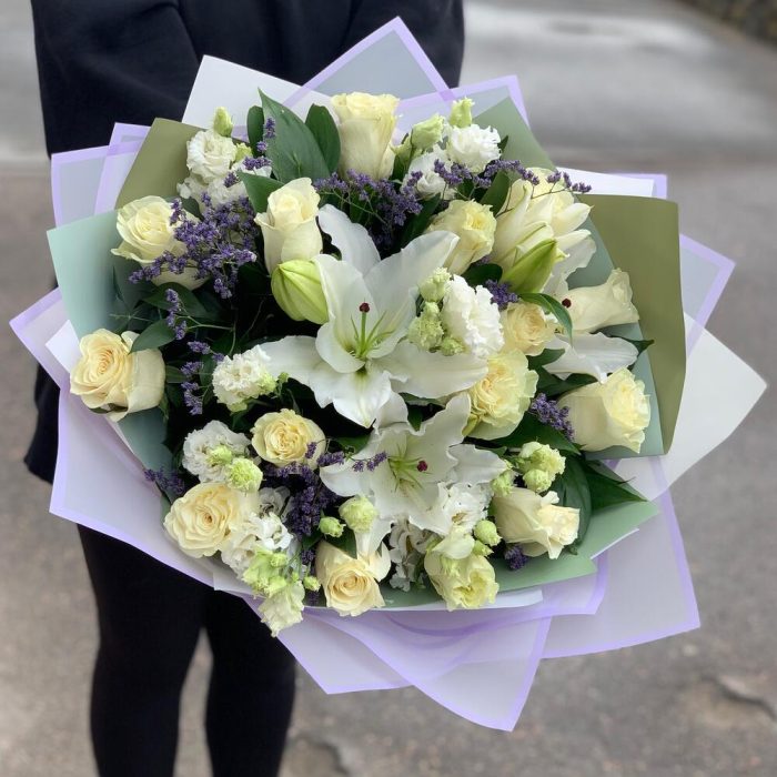 Роза – 15 шт.Лилия – 2 шт.Лизиантус – 4 шт.Лимониум – 2 шт.руссус – 20 шт.Дизайнерская упаковка – 2 шт.