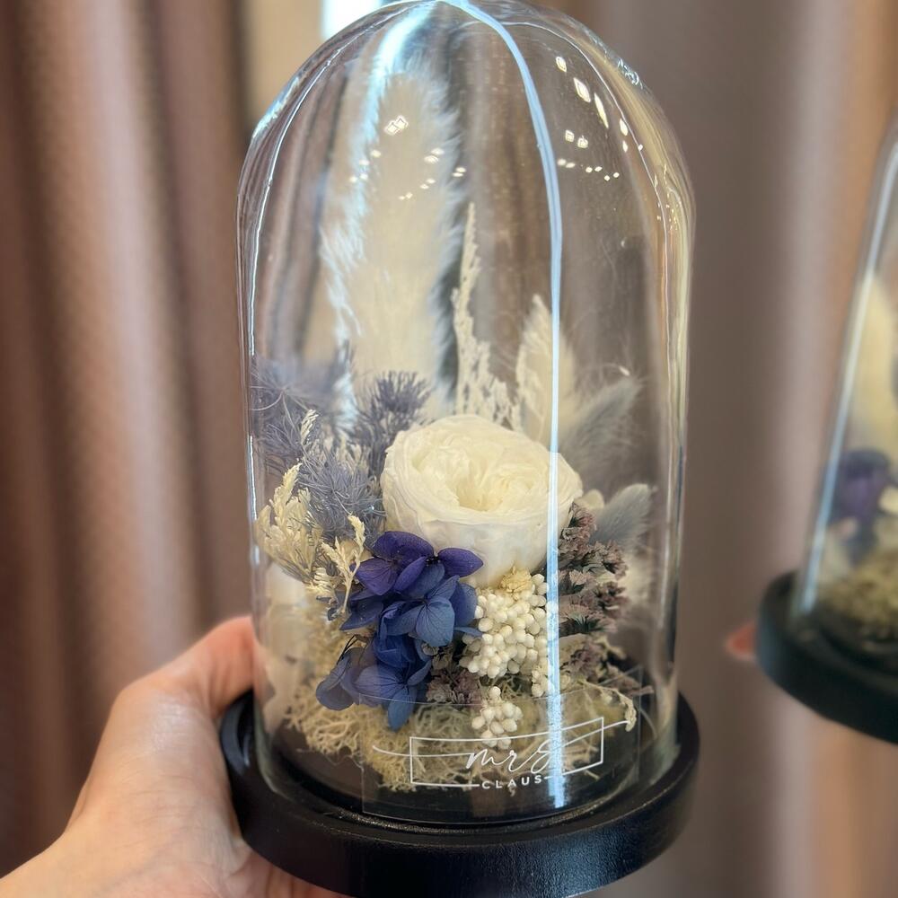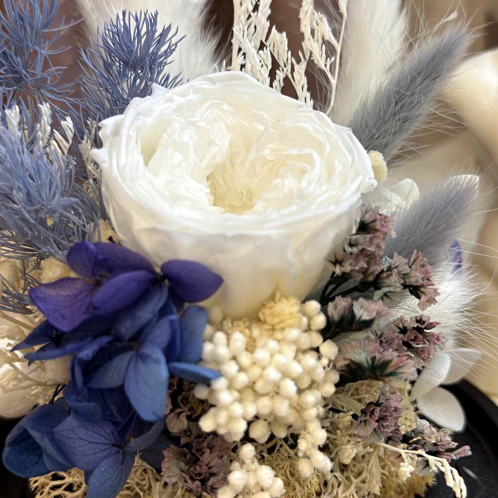 Роза стабилизированная – 1 шт.гортензия стабилизированная – 1 шт.Мох стабилизированный – 1 шт.Сухоцветы – 1 шт.