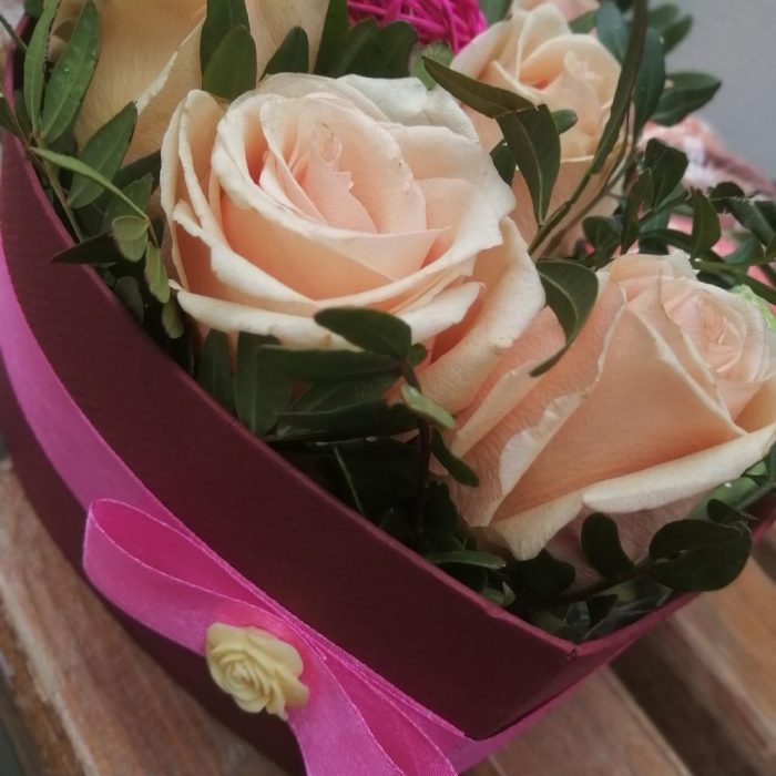 Роза – 7 шт.Зелень – 1 шт.Коробка – 1 шт.Оазис флористический – 1 шт.Макарон – 4 шт.